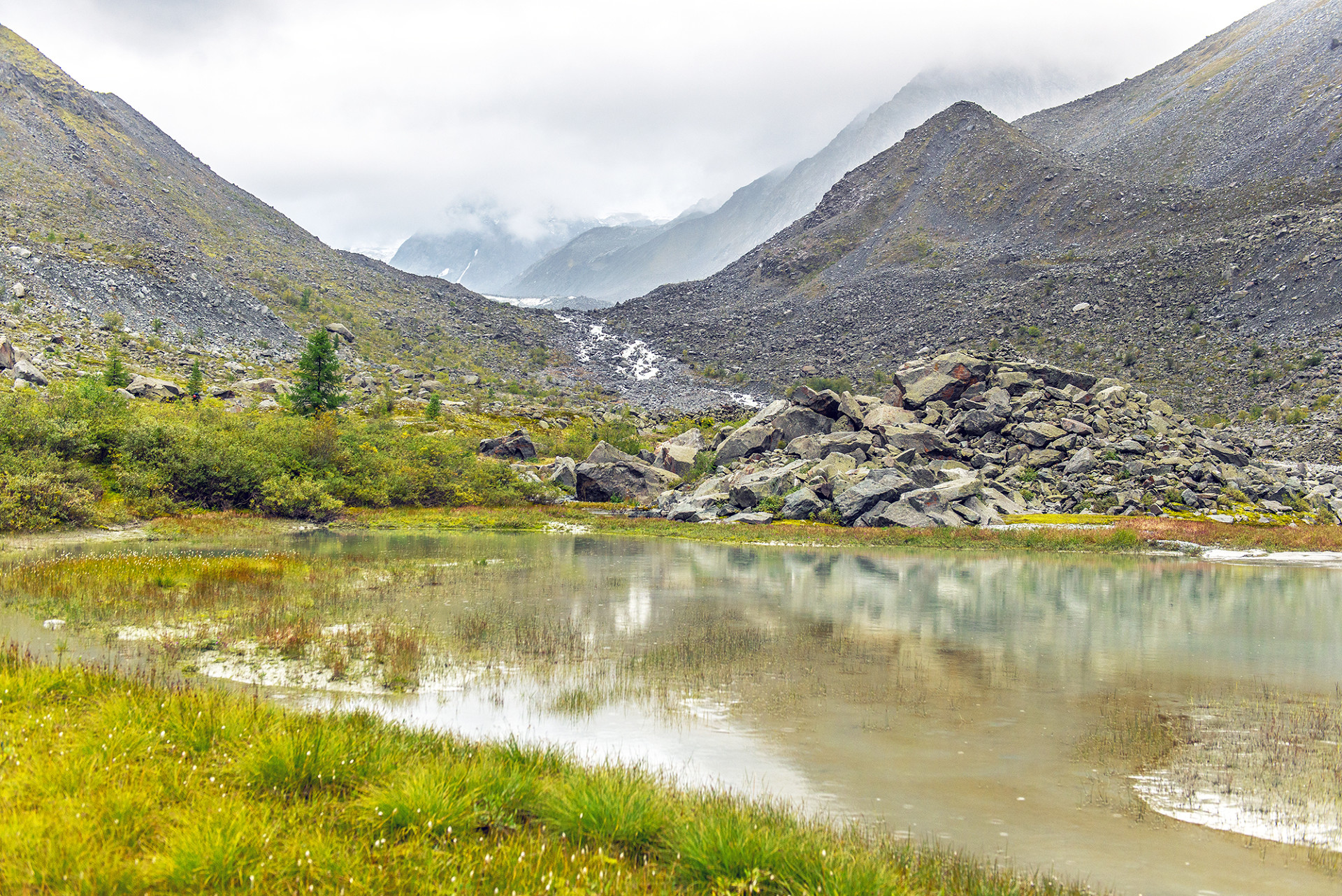 Днем открываются превосходные виды на Белуху. С остановками на отдых и перекус к вечеру мы доходим до озера Аккем (2000 м.) Это красивое место в нашем маршруте является ключевым